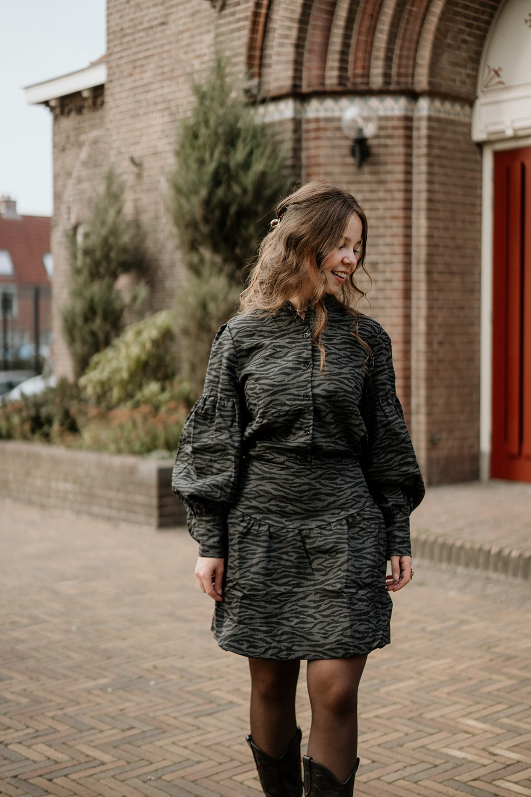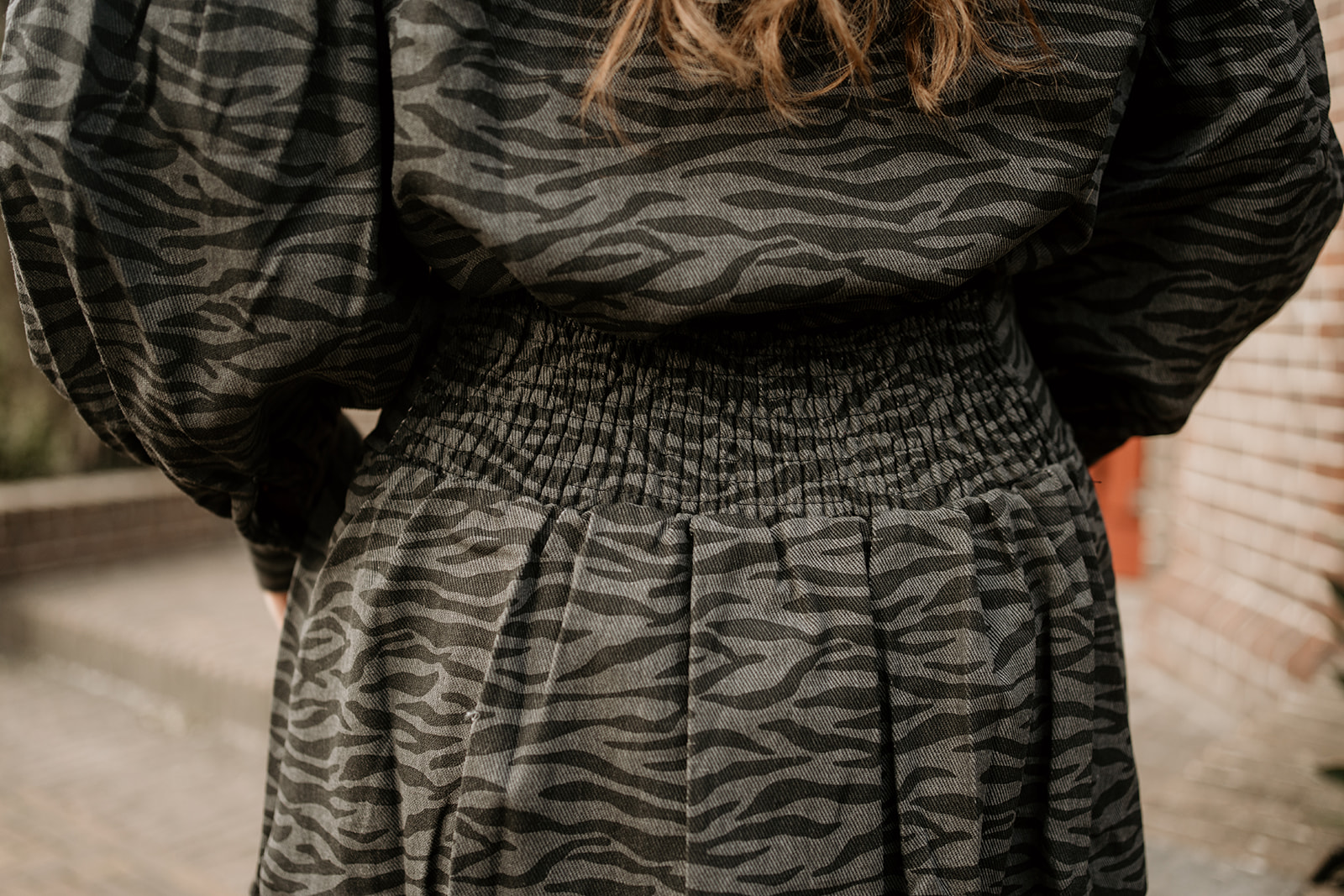 Deze stijlvolle rok met zebraprint is een perfecte combinatie van comfort en karakter. De donkergrijze strepen op een zachte grijze achtergrond geven een moderne twist aan de klassieke animal print. De print is opvallend, maar dankzij de neutrale tinten blijft de look ingetogen en makkelijk te combineren.